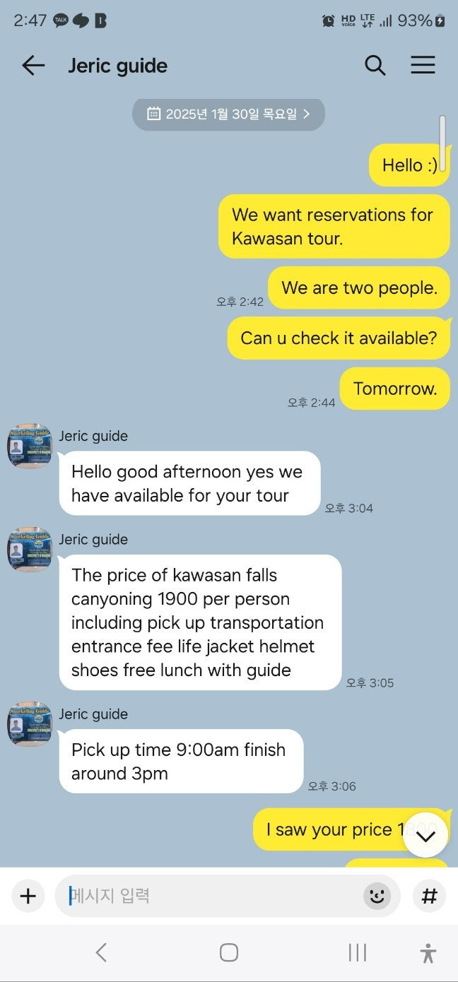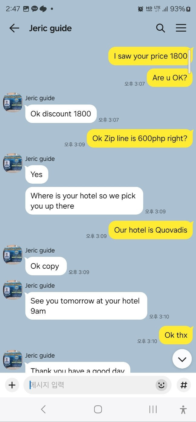 - 처음 제릭과 대화시 집라인 ₱600 이었으나 현장서는 ₱700 요구